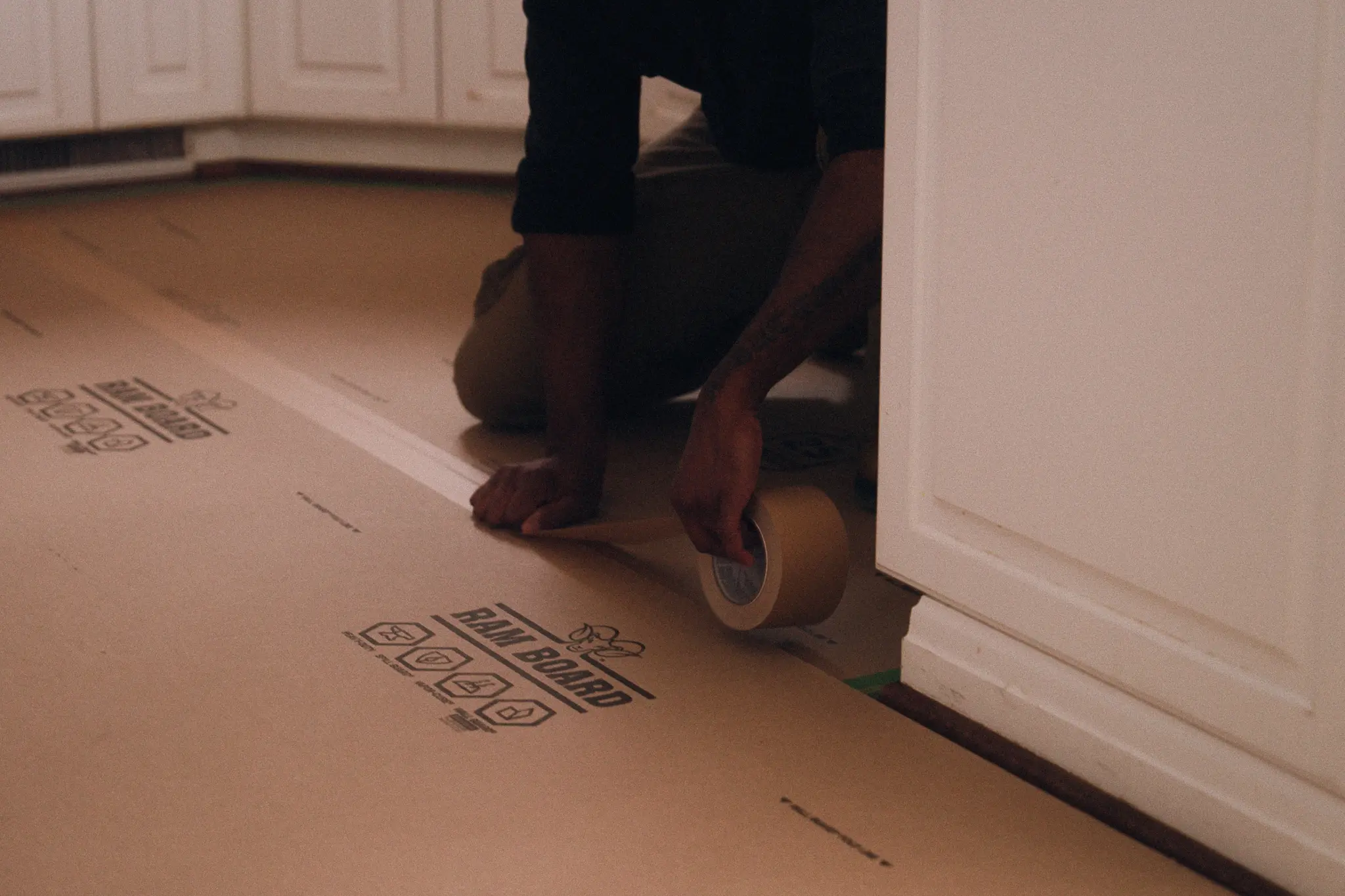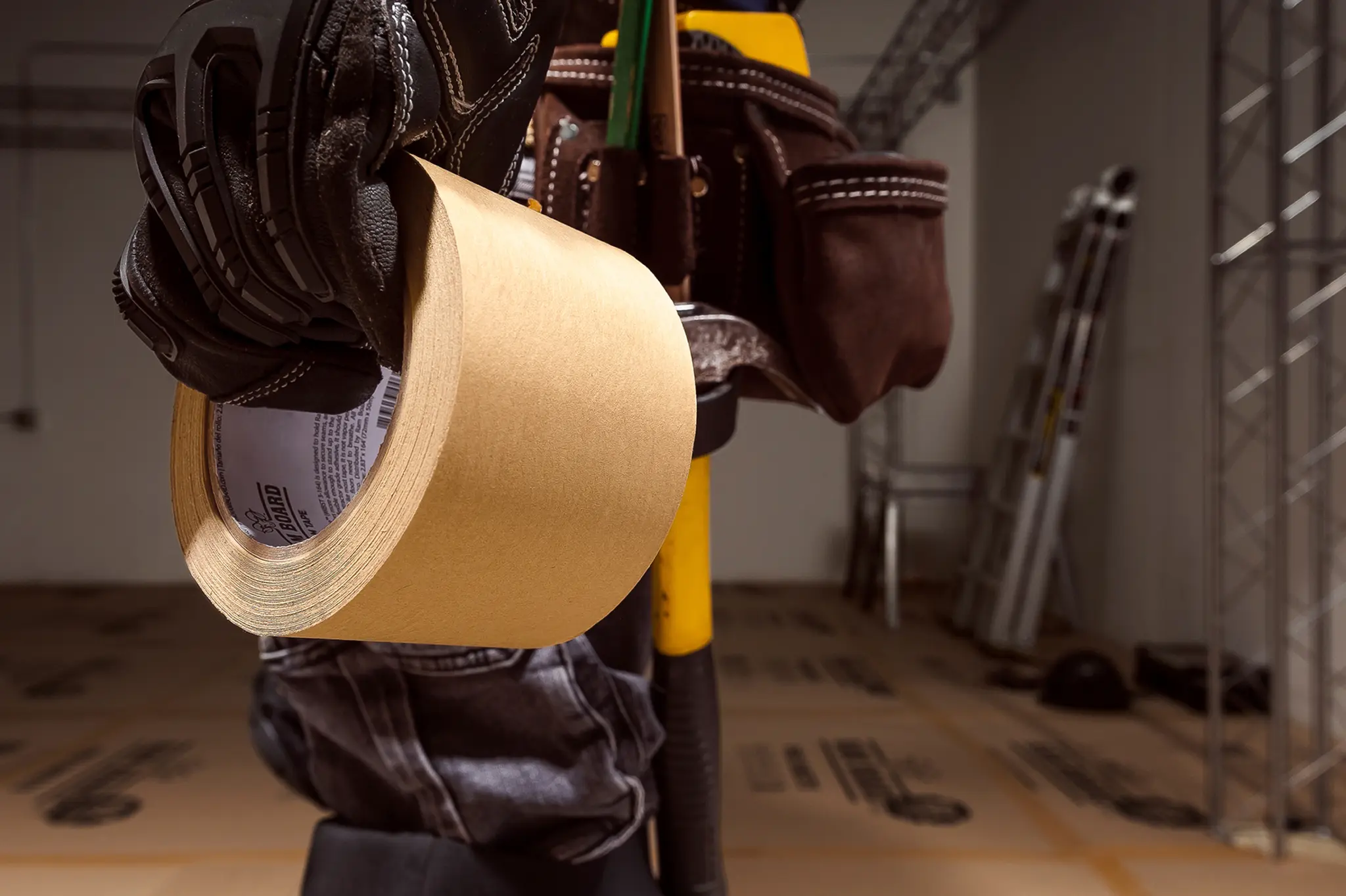 Fita adesiva de alta resistência para união de proteções de pavimento.